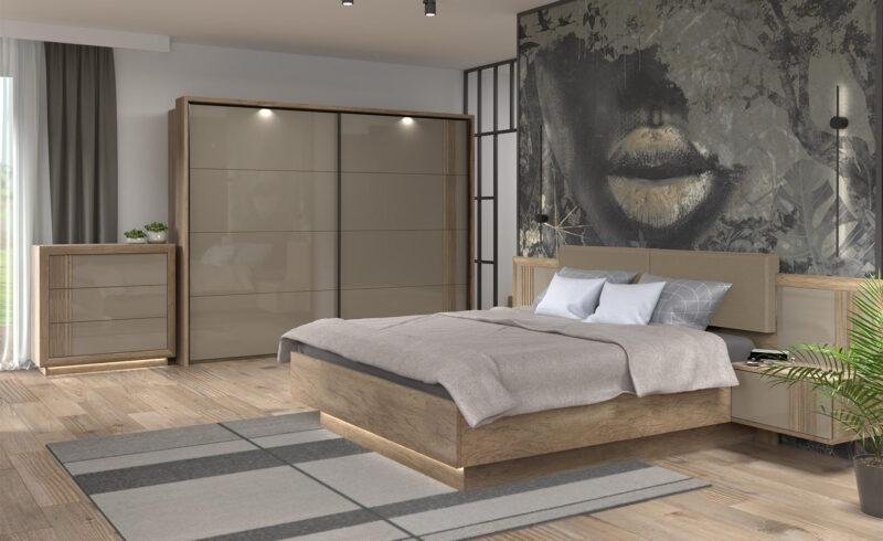 Geniş sürüşmə qapılı dolab sistemi və funksional platforma, baza tipli yataq çərçivəsi